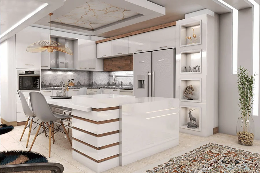 پروژه شهریار: کابینت MDF براق سفید، صفحه ماربل، نورپردازی دکوراتیو و جزیره مرکزی